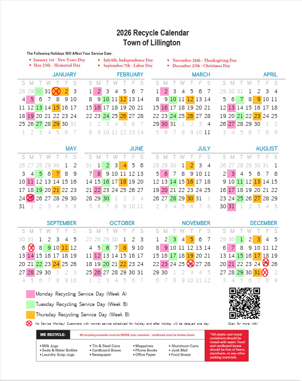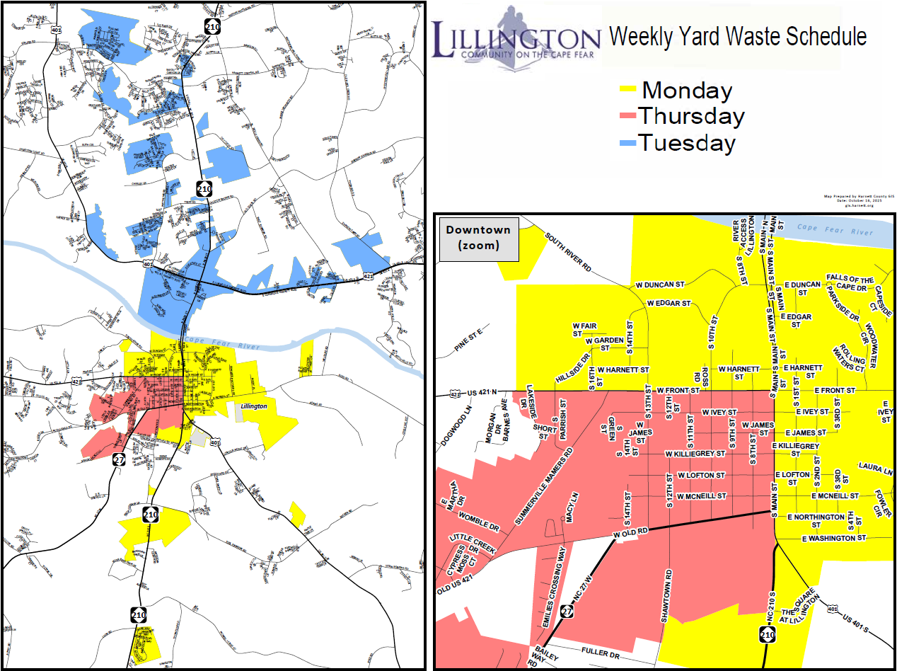 The Town of Lillington’s Public Works Department provides sanitation services to residents and businesses within city limits under the authority of NC General Statute 160A-174 and Chapter 50 of the Lillington Code of Ordinances. Lillington Public Works Department provides weekly yard waste and bulky item pickup, and has contracted with Carolina Trash and Septic (CTS) to provide weekly trash and recycling services in town. Please see below for more information on acceptable/unacceptable waste, guidelines, and schedules.