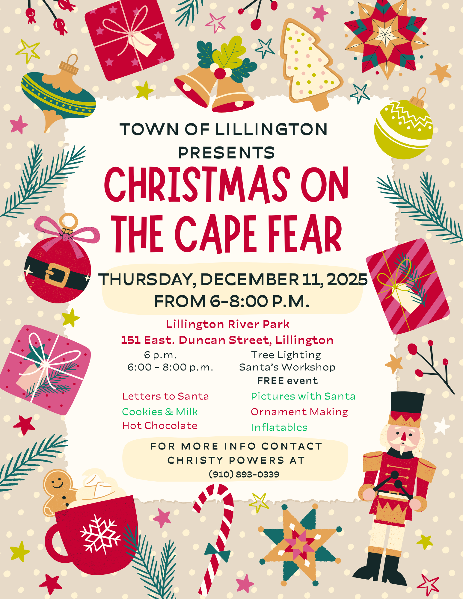 Join us Thursday, December 11th at 6 PM for our annual Christmas on the Cape Fear event. Christmas at the Cape Fear will be held at the Lillington River Park, located at 151 East Duncan Street from 6 PM - 8 PM. There will be several activities such as letters to Santa, the Lillington Christmas Tree Lighting, and more! For more information, please contact Christy Powers at 910-893-0339 or cpowers@lillingtonnc.org.